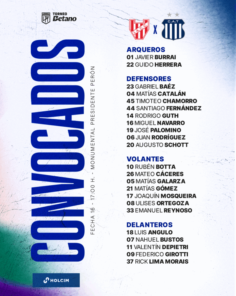 El cuerpo técnico encabezado por Carlos Tévez dispuso una delegación compuesta por 23 jugadores. Con respecto a la última convocatoria reaparece el nombre de Timoteo Chamorro. En contrapartida, Juan Camilo Portilla, convocado a la Selección de Colombia para la disputa de amistosos, no forma parte de la nómina.