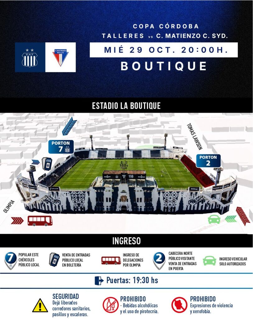 Ubicación de la hinchada de Talleres: Popular Este Chércoles Público Local (Calle Olimpia). Precios de las entradas: $8.000
