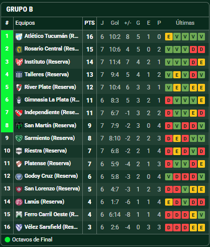 Atlético Tucumán es el puntero del Grupo B con 16 puntos y un partido menos. Lo siguen Rosario Central con 15 e Instituto con 14. Cabe recordar que los primeros 8 de cada zona son los que se clasifican a la siguiente fase eliminatoria.