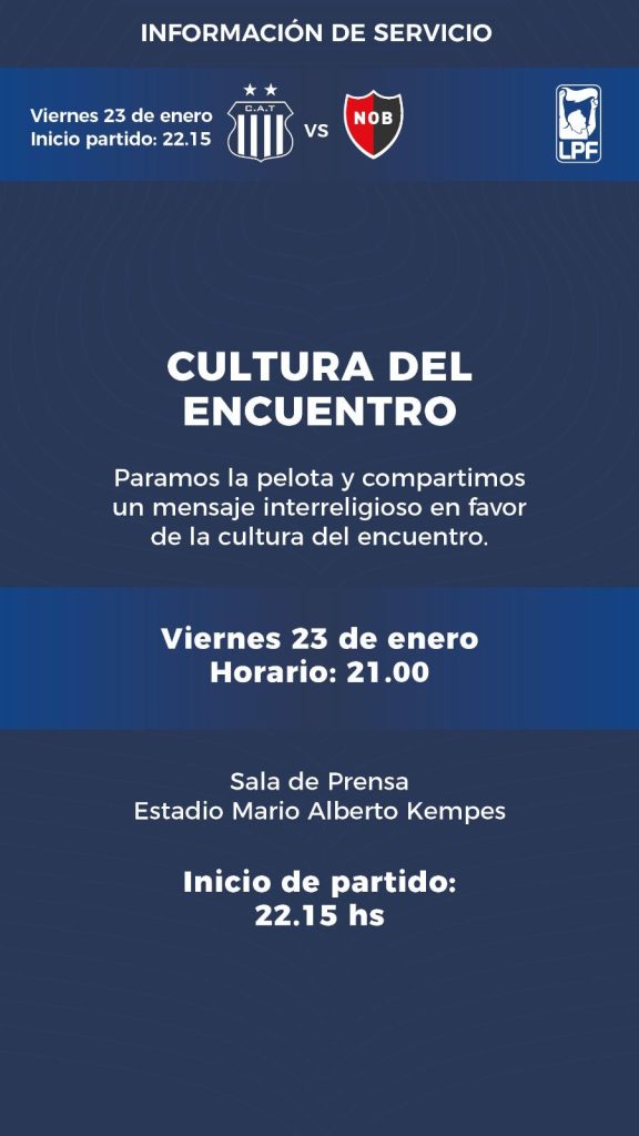 El viernes 23 de enero, a las 21.00 horas, se llevará a cabo un encuentro interreligioso en la Sala de Prensa del Estadio Mario Alberto Kempes, previo al inicio del partido correspondiente a la Liga Profesional de Fútbol.