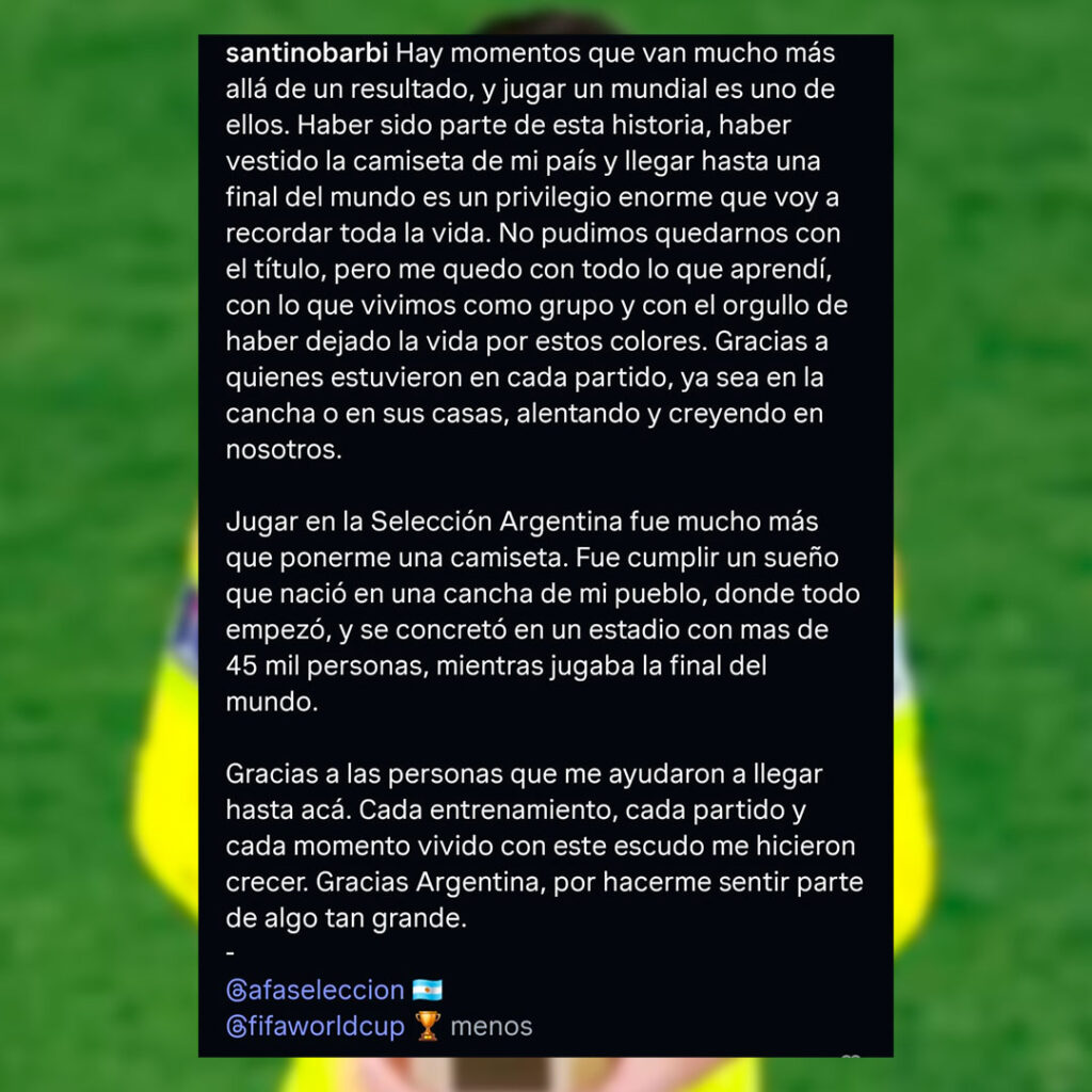 Gracias a las personas que me ayudaron a llegar hasta acá. Cada entrenamiento, cada partido y cada momento vivido con este escudo me hicieron crecer. Gracias Argentina, por hacerme sentir parte de algo tan grande.», escribió Santino.
