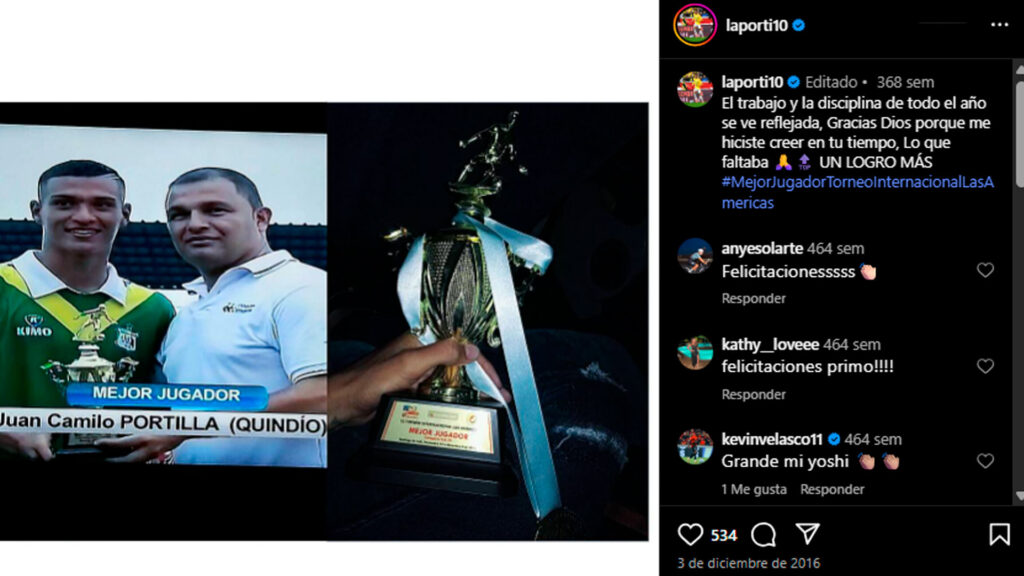 Lo curioso es que hace 9 años Juan Camilo Portilla recibió la misma distinción cuando participó del torneo. En su cuenta de Instagram está publicado el recuerdo.