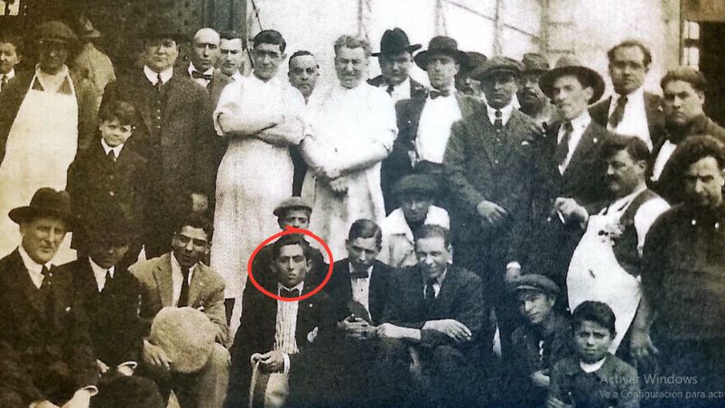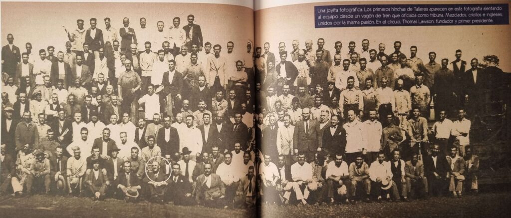 «Una joyita fotográfica. Los primeros hinchas de Talleres aparecen en esta foto alentando al equipo desde un vagón de trenque oficiaba como tribuna. Mezclados criollos e ingleses, unidos por la misma pasión. En el círculo, Thomas Lawson, fundador y primer presidente».