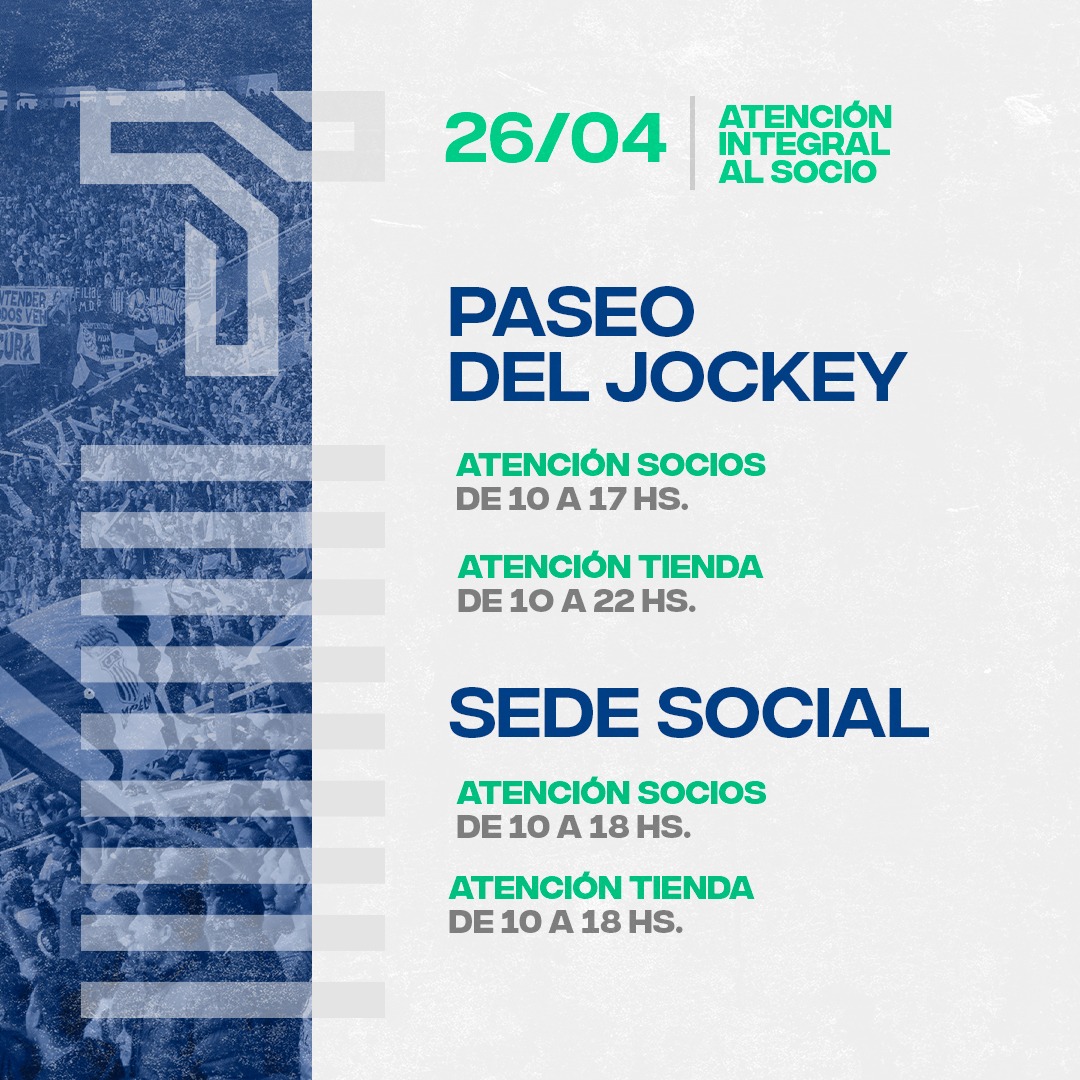 En virtud del compromiso que disputará el primer equipo Albiazul ante Sporting Cristal de Perú, este martes a las 21.30 hs, se modificaron los horarios de atención tanto en la Sede Social como en el Paseo del Jockey. A continuación, los detalles: